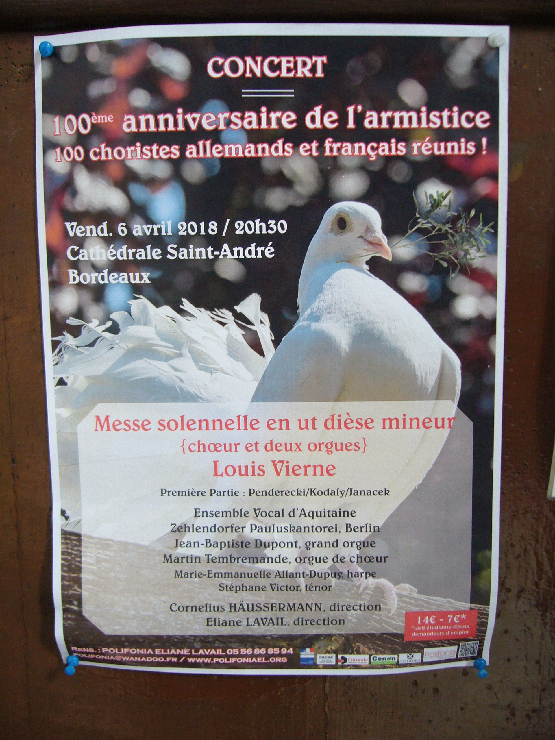 Unter diesem Motto stand ein Konzert, das die Zehlendorfer Pauluskantorei zusammen mit dem Ensemble Vocal d’Aquitaine am 6.April in der Kathedrale Saint-André in Bordeaux gegeben hat. Unter der Leitung von Eliane Lavail sangen die vereinigten Chöre Louis Viernes Messe cis-moll aus dem Jahre 1901 für Chor und zwei Orgeln, ein Werk, das zu den Höhepunkten der französischen Orgelmessen gehört.