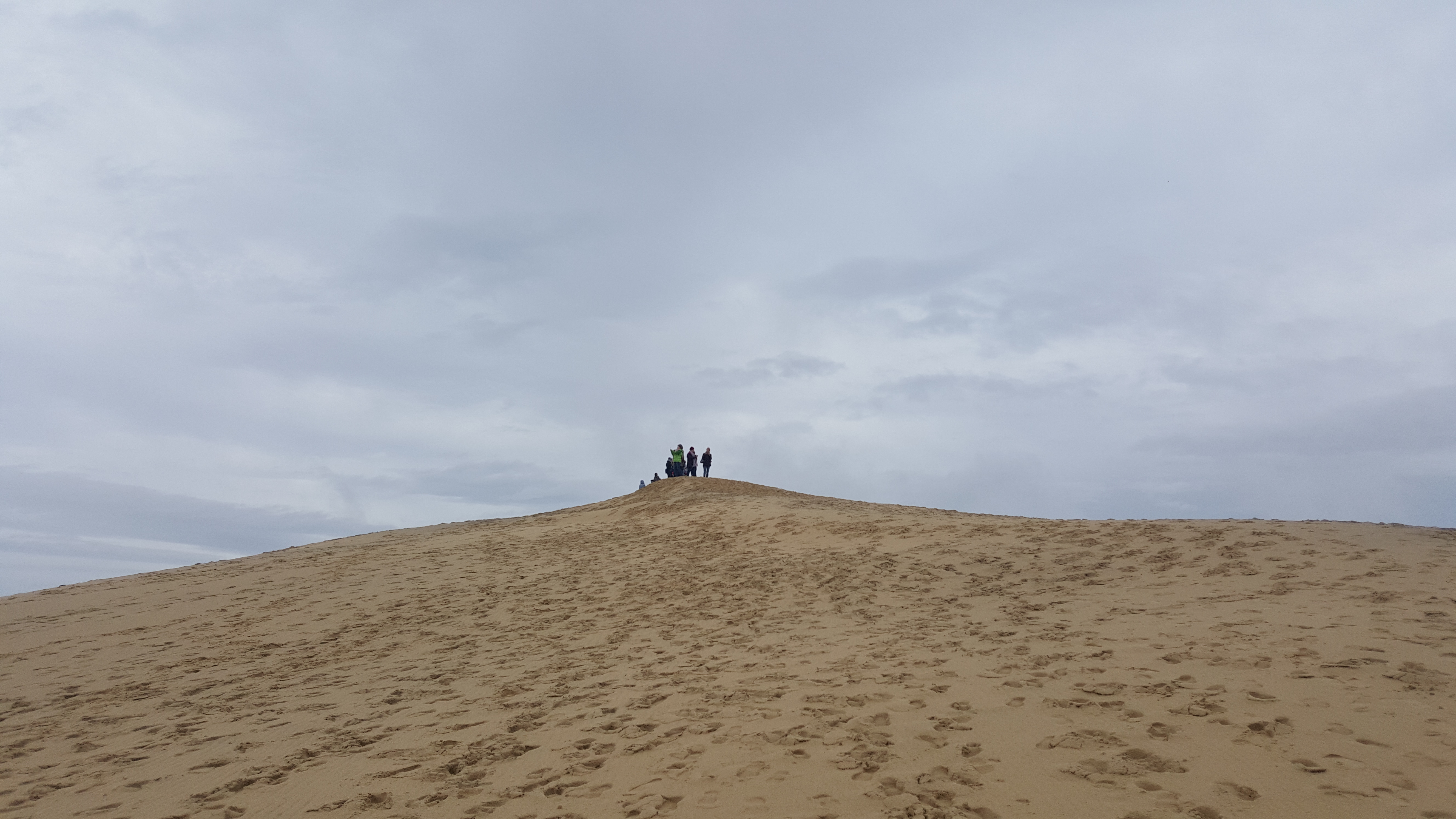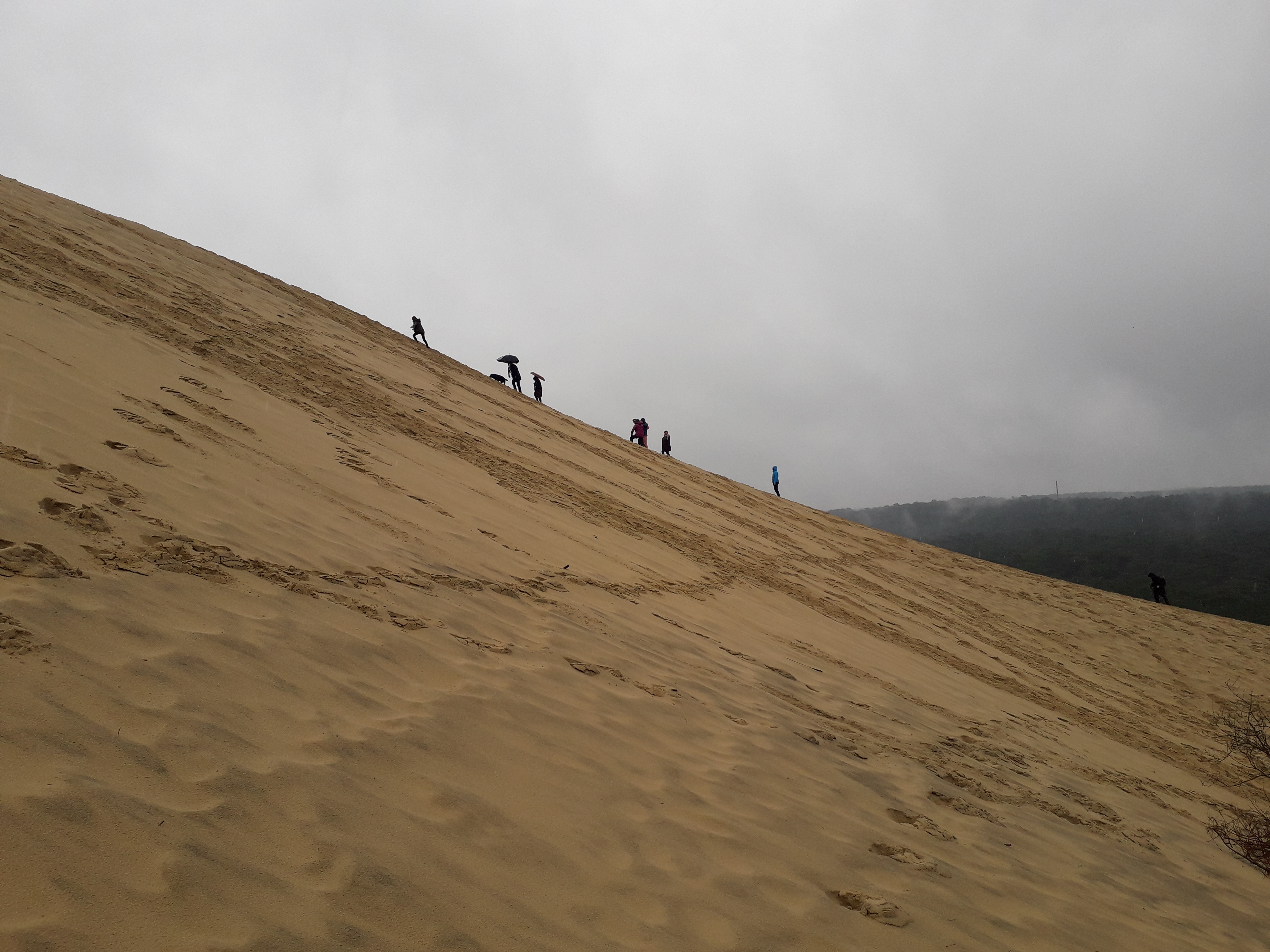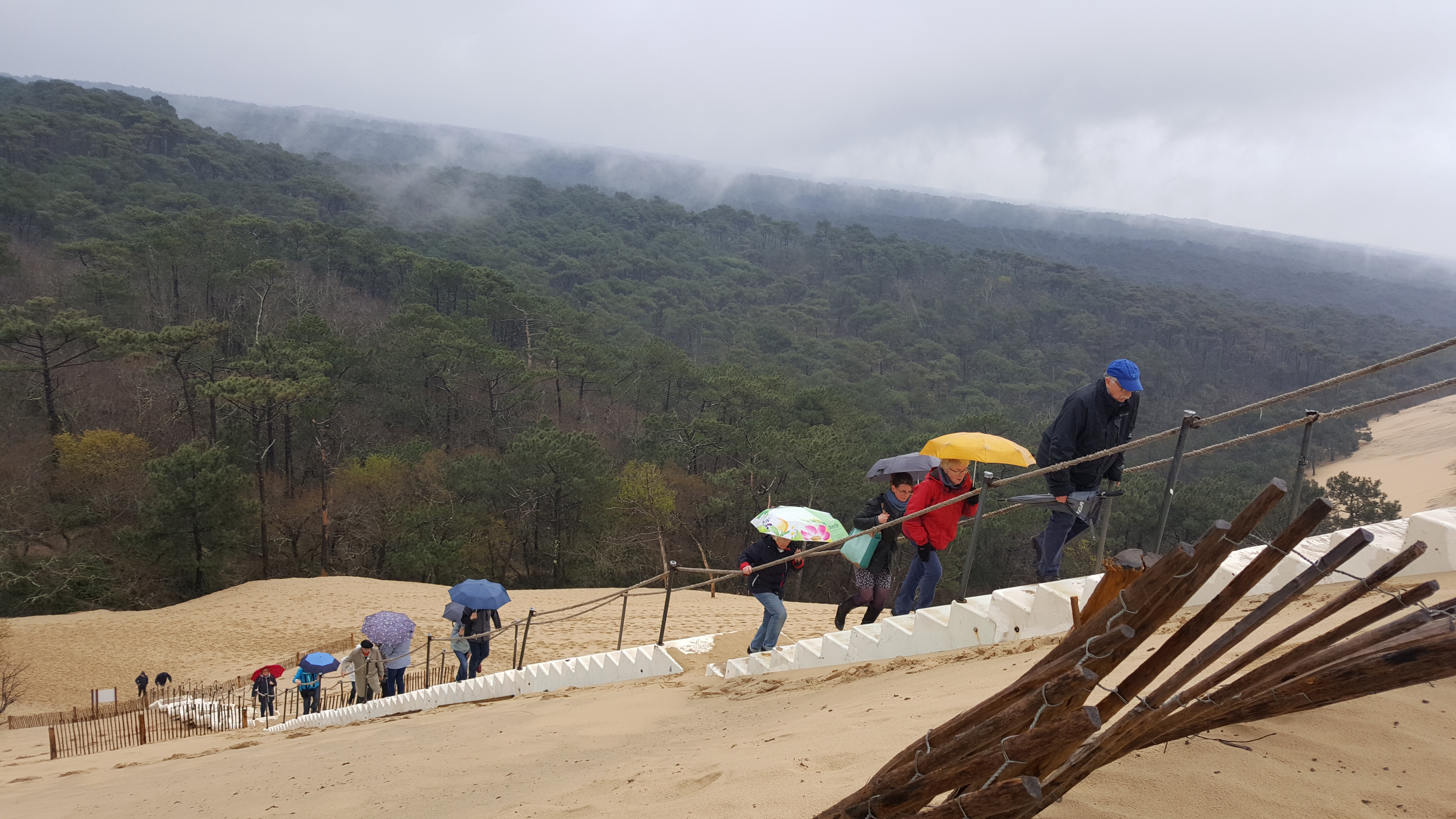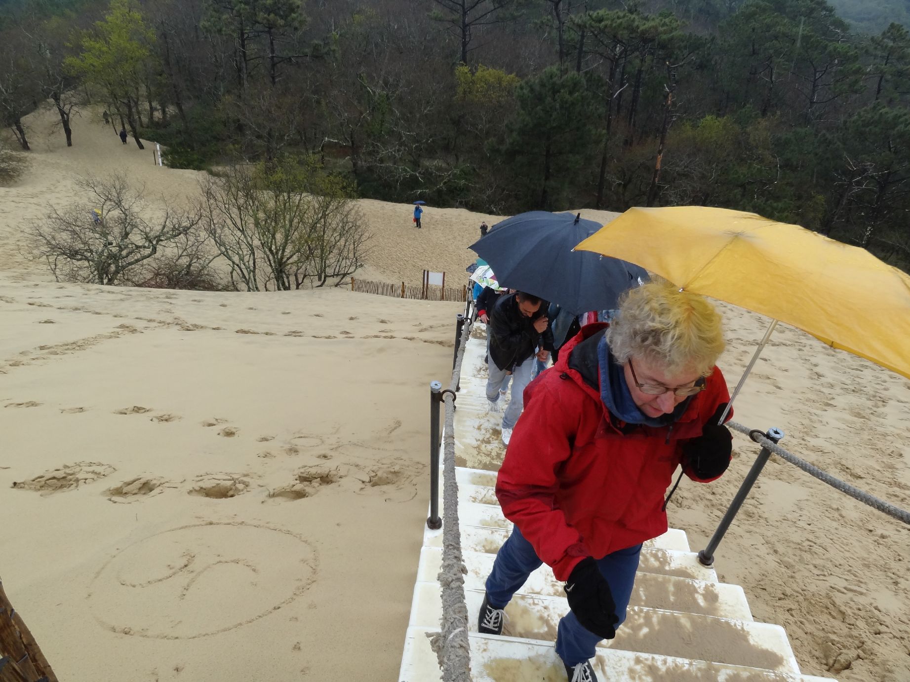 Abgerundet wurde unsere Reise von einem Ausflug an die Atllantikküste am verregneten Folgetag – mit dem Bus fuhren wir nach Arcachon und umrundeten mit einem Ausflugsboot das große Becken mit seinen Austernbänken, einer unter Naturschutz stehenden Vogelinsel bis zum Kap Ferret. Auch das Naturwunder der größten europäischen Wanderdüne, die bis zu 110 m in die Höhe ragt, die „Dune du Pilat“ wurde im durchnässten Sand erklommen – den mühevolle Aufstieg belohnte ein weiter Ausblick über die ganze Bucht.